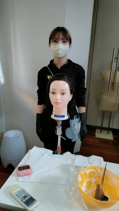 新人の四家さんと小野さんは、カラー塗布の練習をしていました!