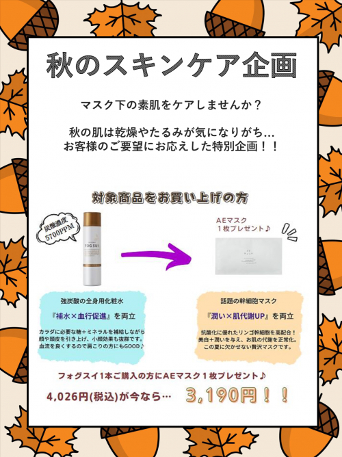 リィーフでは、秋のスキンケアを始めていない方にオススメな「フォグスイ」キャンペーンを開催中です。