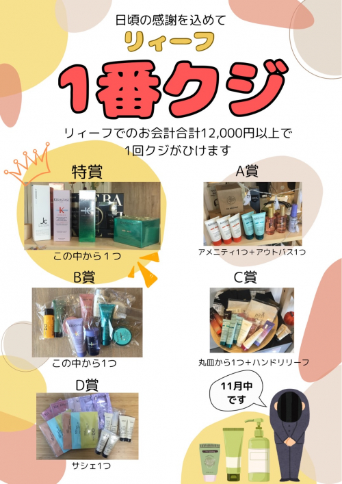 リィーフでのお会計金額12,000円以上でくじが引けて、「特賞」「A賞」「B賞」「C賞」「D賞」どれかが当たりますよ。
