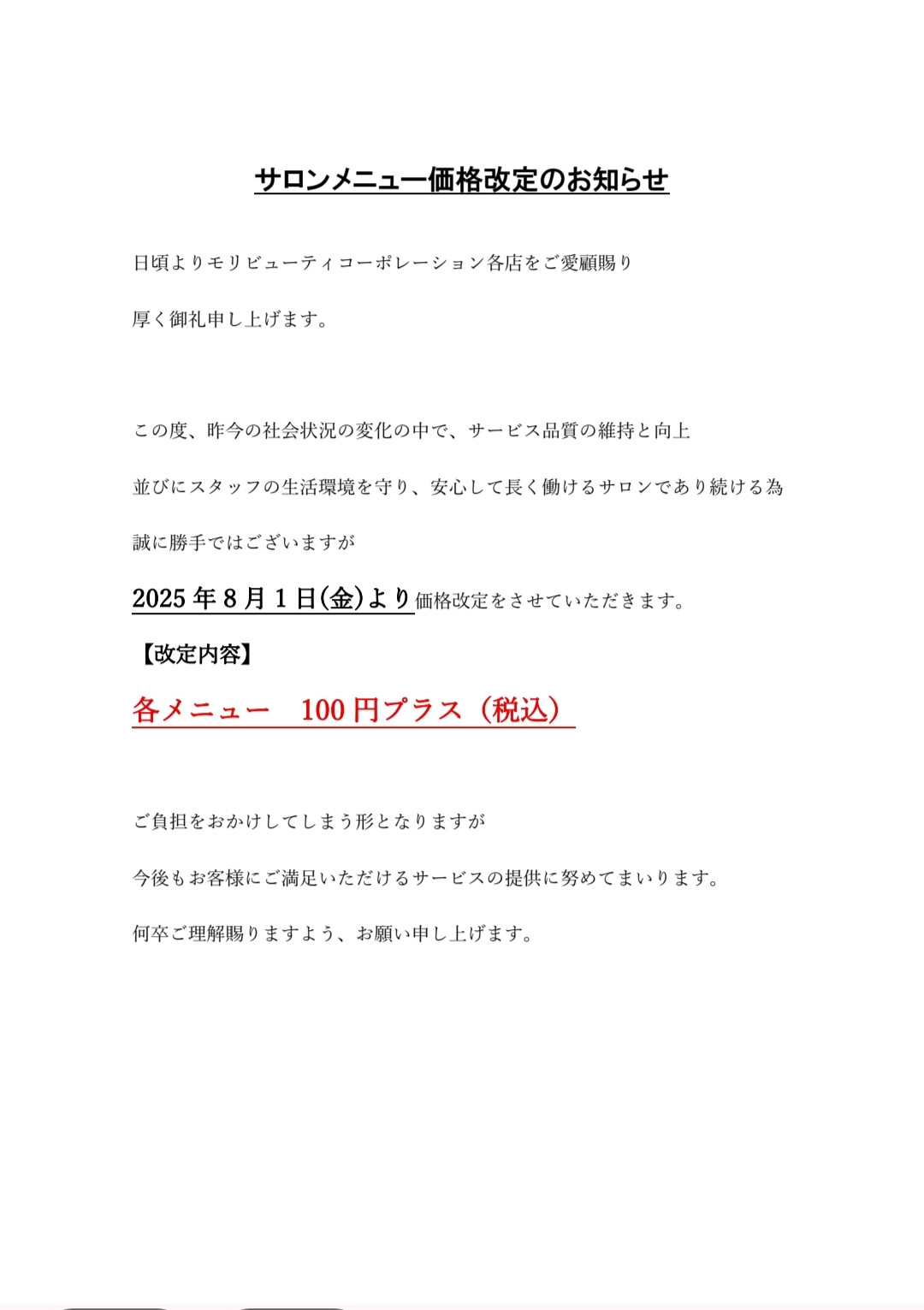 すべてのメニュー価格に +100円(税込) の改定を予定しております。